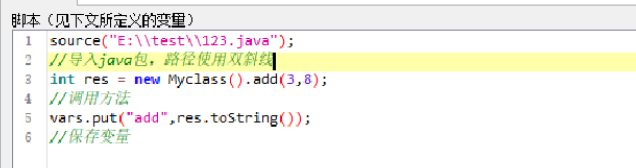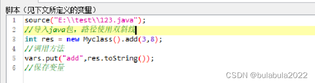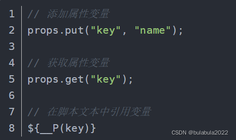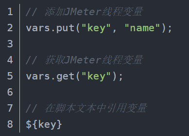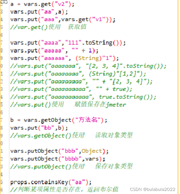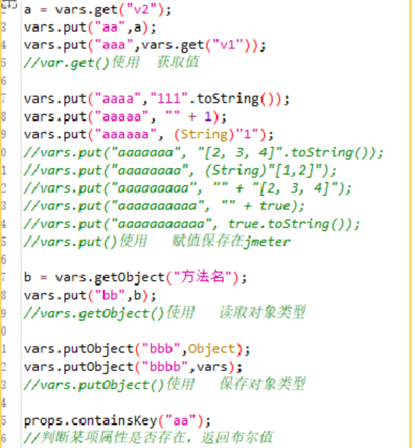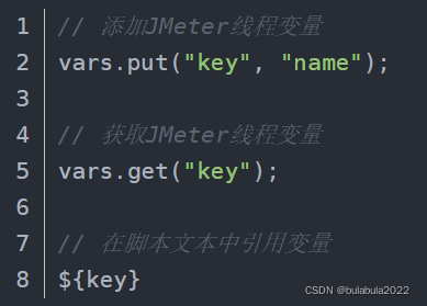 vars可以说是最常用的内置变量,其类型为JMeterVariables,其作用是添加或获取JMeter线程变量: