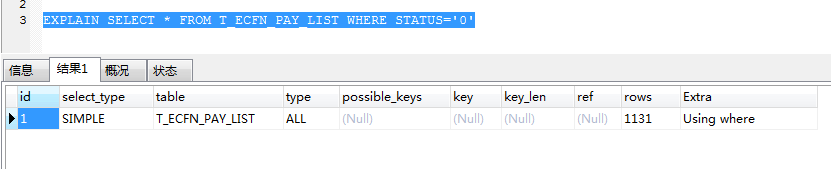 EXPLAIN SELECT * FROM T_ECFN_PAY_LIST WHERE STATUS='0'