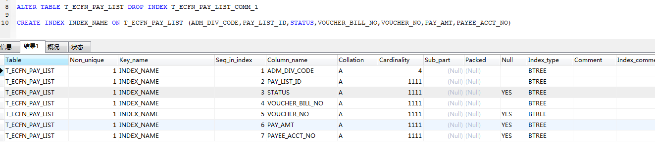 CREATE INDEX INDEX_NAME ON T_ECFN_PAY_LIST (ADM_DIV_CODE,PAY_LIST_ID,STATUS,VOUCHER_BILL_NO,VOUCHER_NO,PAY_AMT,PAYEE_ACCT_NO) //新创建索引