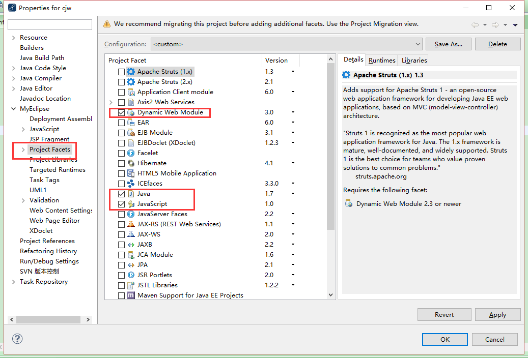 3、我们回到项目abc,右击,选择最后的properties选项(也可以直接按住快捷键alt+enter)。在右边勾选如图示的三项:Dynamic Web Module、Java、JavaScript。点击apply,确认,等待更新配置。