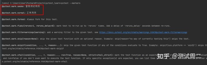 ③添加后字段注册标记名称后,使用 pytest --markers 命令行参数运行可以查看到添加的标记名称。
