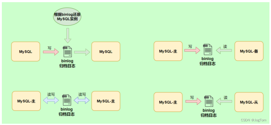 可以说MySQL数据库的数据备份、主备、主主、主从都离不开binlog,需要依靠binlog来同步数据,保证数据一致性。