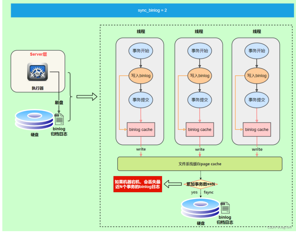 为了安全起见,可以设置为 1 ,表示每次提交事务都会执行fsync,就如同redo log 刷盘流程一样。 最后还有一种折中方式,可以设置为N(N>1),表示每次提交事务都write,但累积N个事务后才fsync。