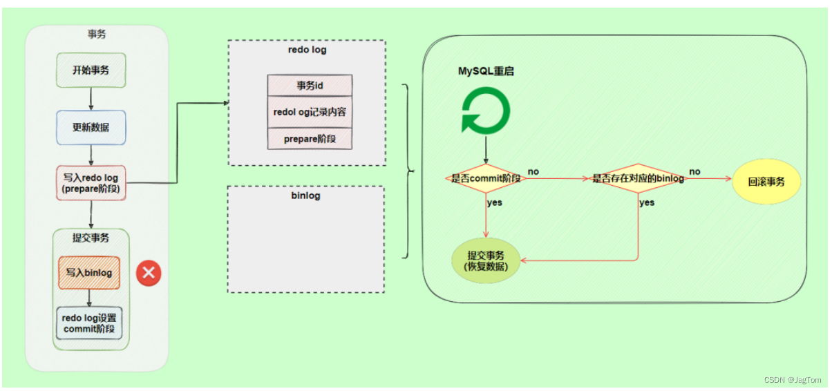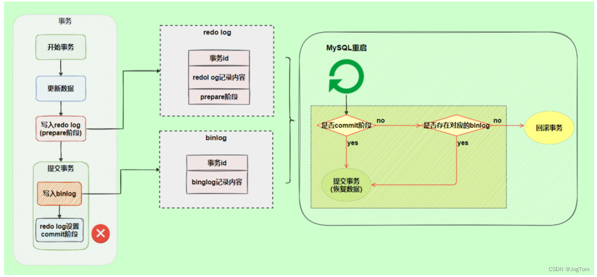 并不会回滚事务,它会执行上图框住的逻辑,虽然redo log是处于prepare阶段,但是能通过事务id找到对 应的binlog日志,所以MySQL认为是完整的,就会提交事务恢复数据。