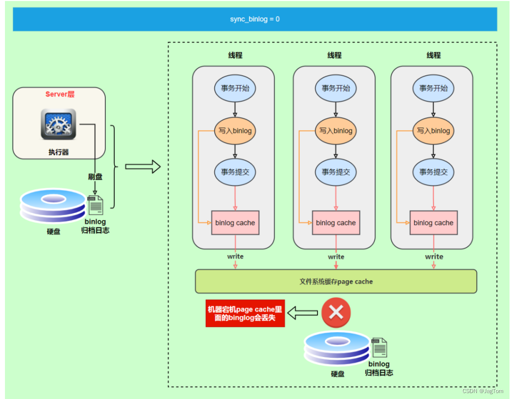 write和fsync的时机,可以由参数 sync_binlog 控制,默认是 0 。为0的时候,表示每次提交事务都只 write,由系统自行判断什么时候执行fsync。虽然性能得到提升,但是机器宕机,page cache里面的 binglog 会丢失。如下图: