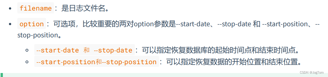 mysqlbinlog [option] filename|mysql –uuser -ppass;这个命令可以这样理解:使用mysqlbinlog命令来读取filename中的内容,然后使用mysql命令将这些内容 恢复到数据库中。