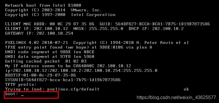 7.3 启动虚拟机,看到 'boot:' 提示符,说明服务器端配置成功!