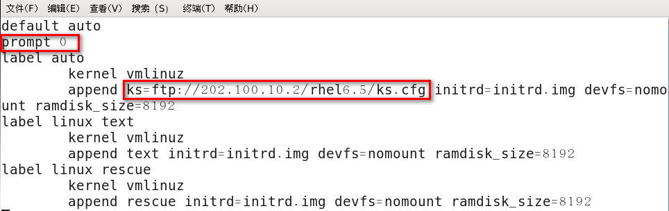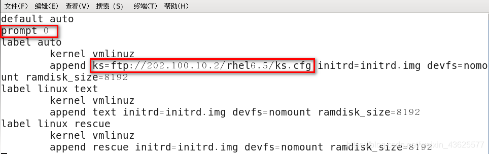 - 在服务端配置好自动应答文件(/root/ks.cfg),实现客户端无人值守安装