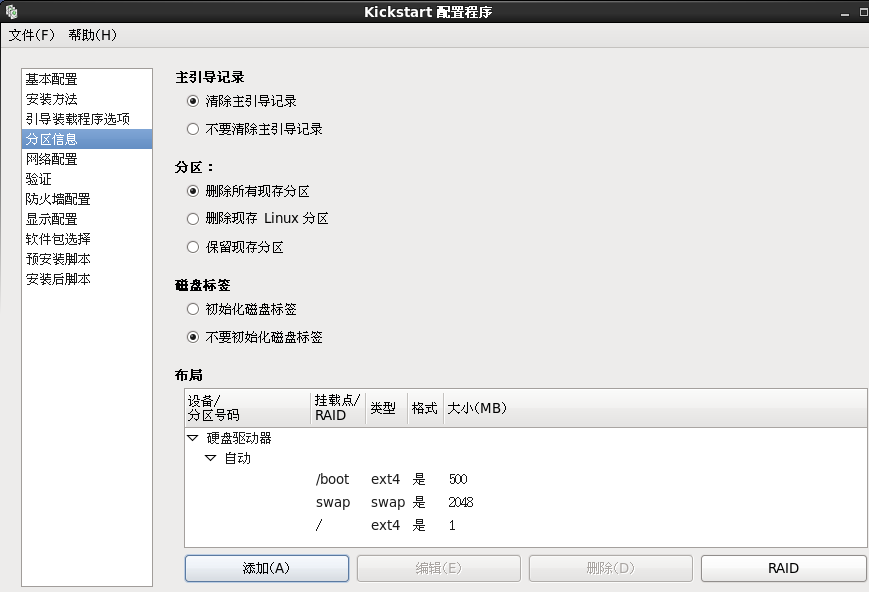 (3)必须设置分区:(1)清除主引导记录(2)删除所有现存分区(3)添加磁盘分区:/boot ext4 500M、swap 2048M、 / ext4 未使用的全部磁盘空间