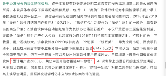 涉案软件“微信自动抢红包”在OPPO软件商店、PP助手、“豌豆荚”、华为应用市场、百度手机助手、酷派应用商店等安卓应用分发平台的下载量总计超过6747.6万次。