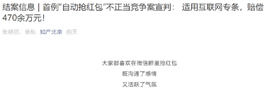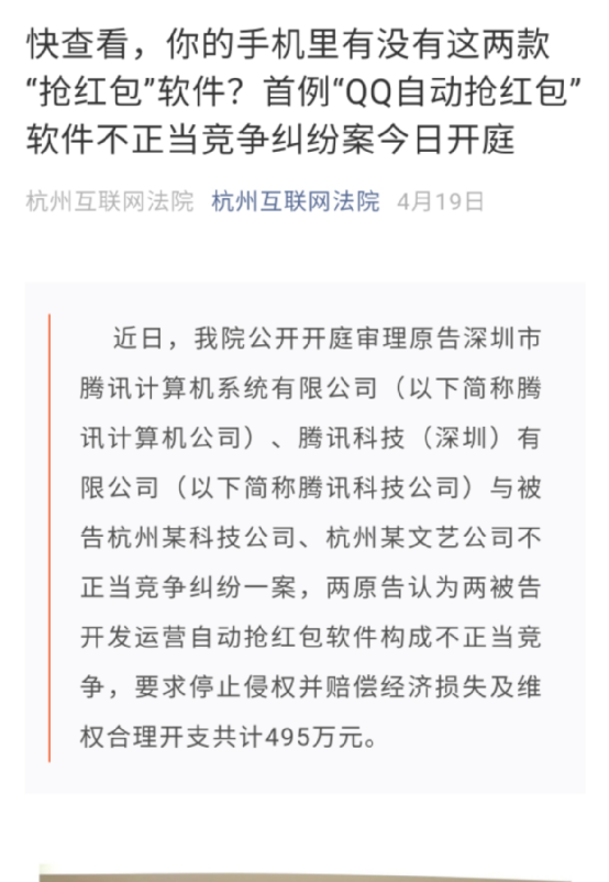 据北京知产法院7月16日通告,该院近日审结了这例也是首例与自动抢红包有关的不正当竞争纠纷案。