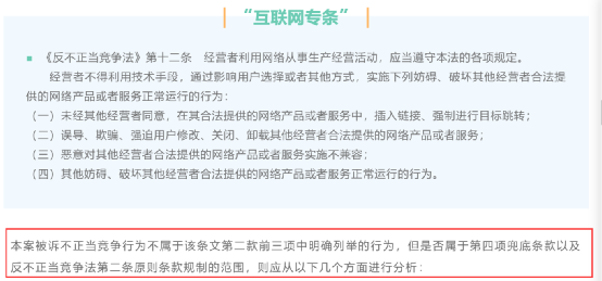 其一,经营者是否利用网络从事生产经营活动,与其他经营者存在竞争关系;其二,经营者是否利用技术手段,通过影响用户选择或者其他方式,实施了妨碍、破坏其他经营者合法提供网络产品或者服务正常运行的行为;其三,该行为是否系扰乱互联网环境中市场竞争秩序,损害其他经营者或者消费者的合法权益的不正当行为;其四,该行为是否违反了诚信原则以及商业道德等。