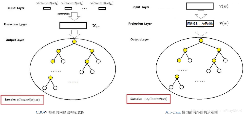 输出层:为Huffman树,以语料中出现过的词作为叶子结点,以各词在语料中出现的次数为权重。假设词汇表V中的词有N个,则树中有叶子结点N个,非叶子结点N-1个(黄色结点)。