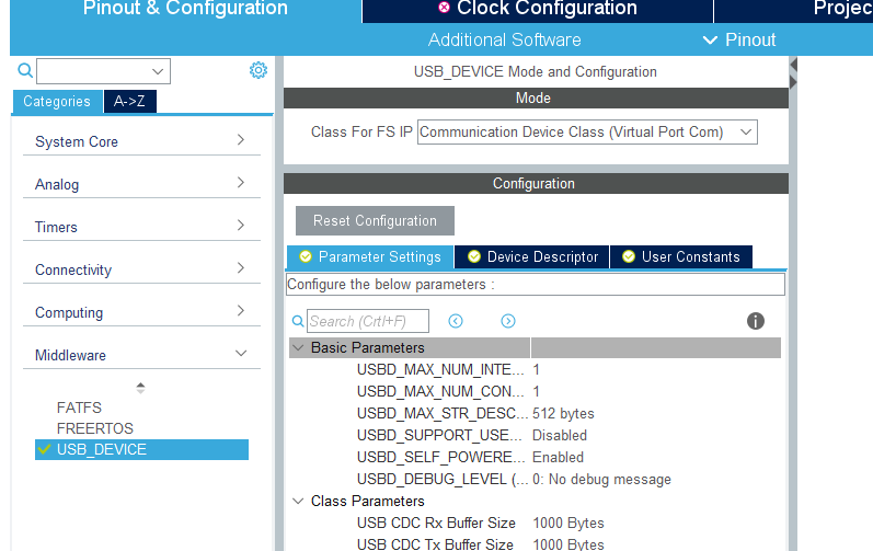 ->Middleware-USB-DEVICE里Class For FS IP选择Communication Device Class(Virtual Port Com)