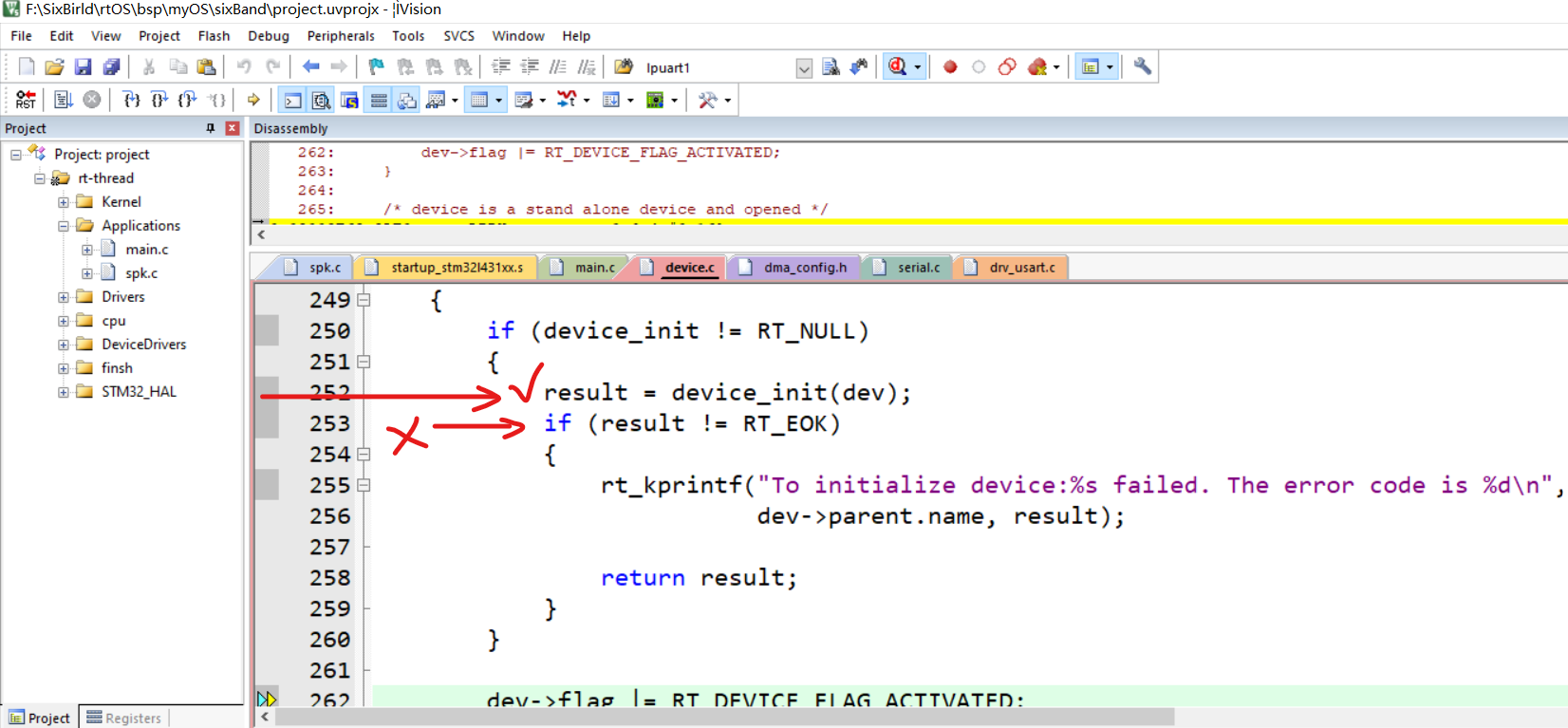 可以说代码很简单,之前的相同的程序都能过了,不知道怎么这次就是通过不了。单步跟踪后发现,在跟踪到rt_device_open时,发现返回值是0,但多走一步,就会变成0xFFFFFFF1(保持默认的串口配置)或0xFFFFFFF8(执行rt_device_control,更改了串口配置)。如下,在device.c文件中rt_device_open: