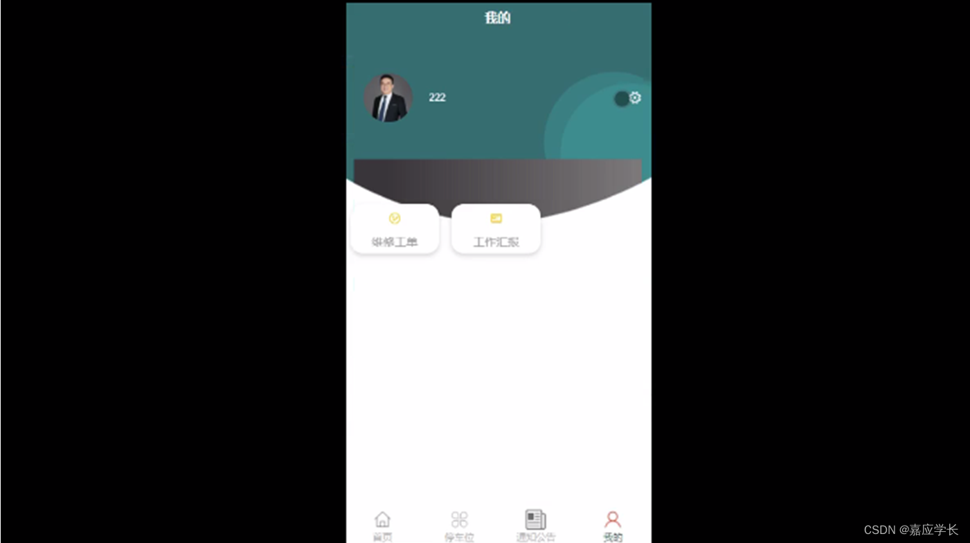 工作人员通过登录进入小程序可查看首页、停车位、通知公告、我的等内容,如图5-9所示。