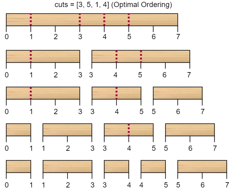 而将切割顺序重新排列为 [3, 5, 1, 4] 后,总成本 = 16(如示例图中 7 + 4 + 3 + 2 = 16)。
