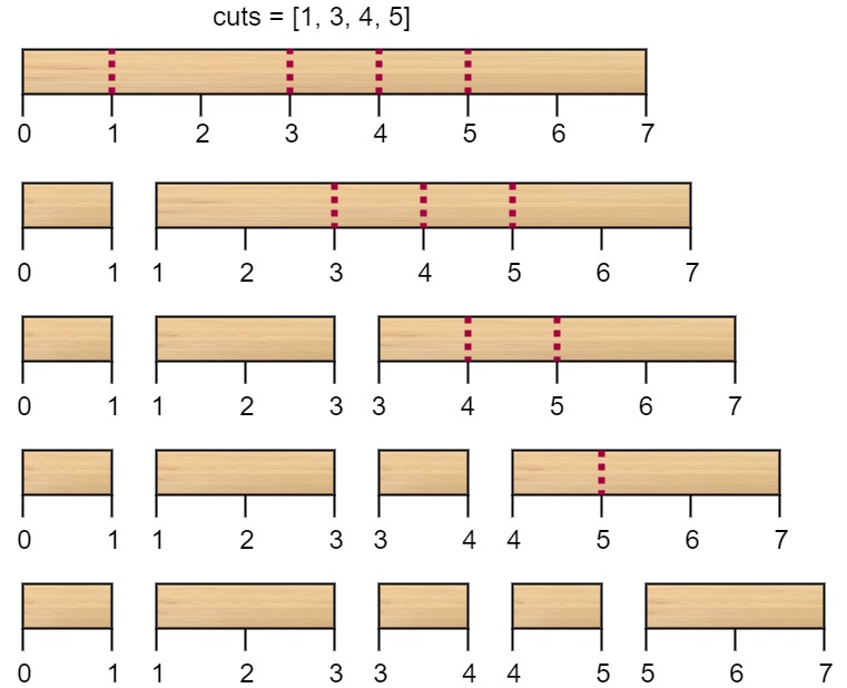 解释:按 [1, 3, 4, 5] 的顺序切割的情况如下所示: