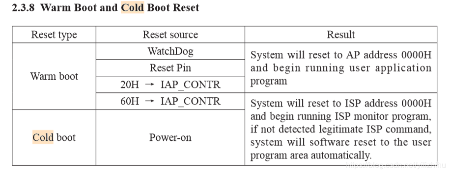 Cold reset就是冷启动:系统从ISP地址重新跑,这种在上电以及单独操作寄存器2种情况下触发。当检测不到ISP命令时,系统就会软复位,跳转到用户程序。这里面ISP检测程序的主要作用是检测烧录程序。