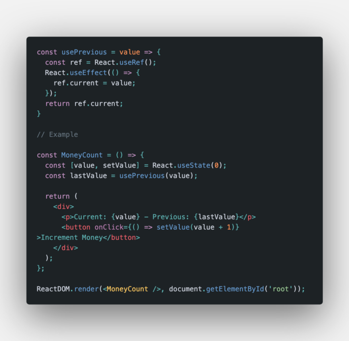 这是我们可以在应用程序中使用的另一个很棒的自定义钩子。有了它,我们可以存储道具或之前的状态。首先,我们创建一个接受值的自定义钩子。然后使用useRef钩子为该值创建一个引用。最后,我们使用useEffect来记住最新的值。