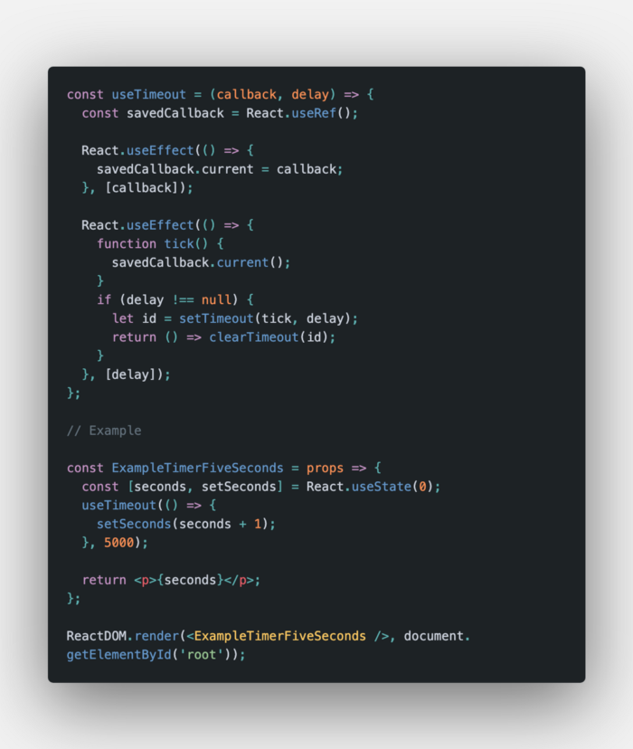有了这个钩子,我们可以用声明的方式实现setTimeout。首先,我们创建一个带有回调和延迟的自定义钩子。然后使用useRef钩子为回调函数创建一个引用。最后,我们利用了两次使用效果。一次用于记住最后一次回调,一次用于设置超时和清理。
