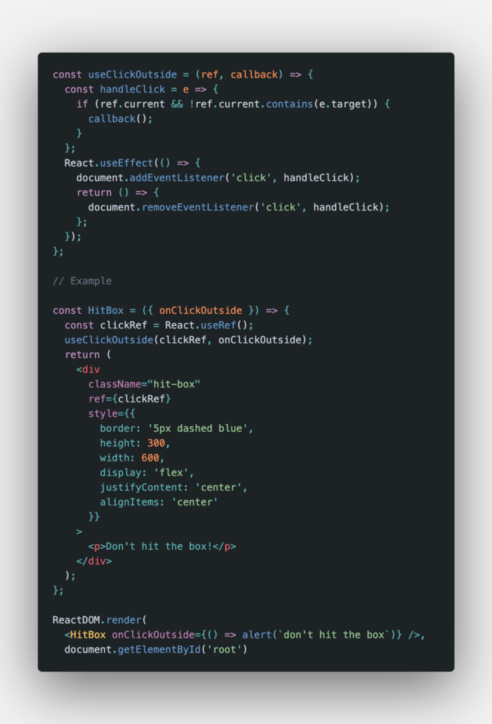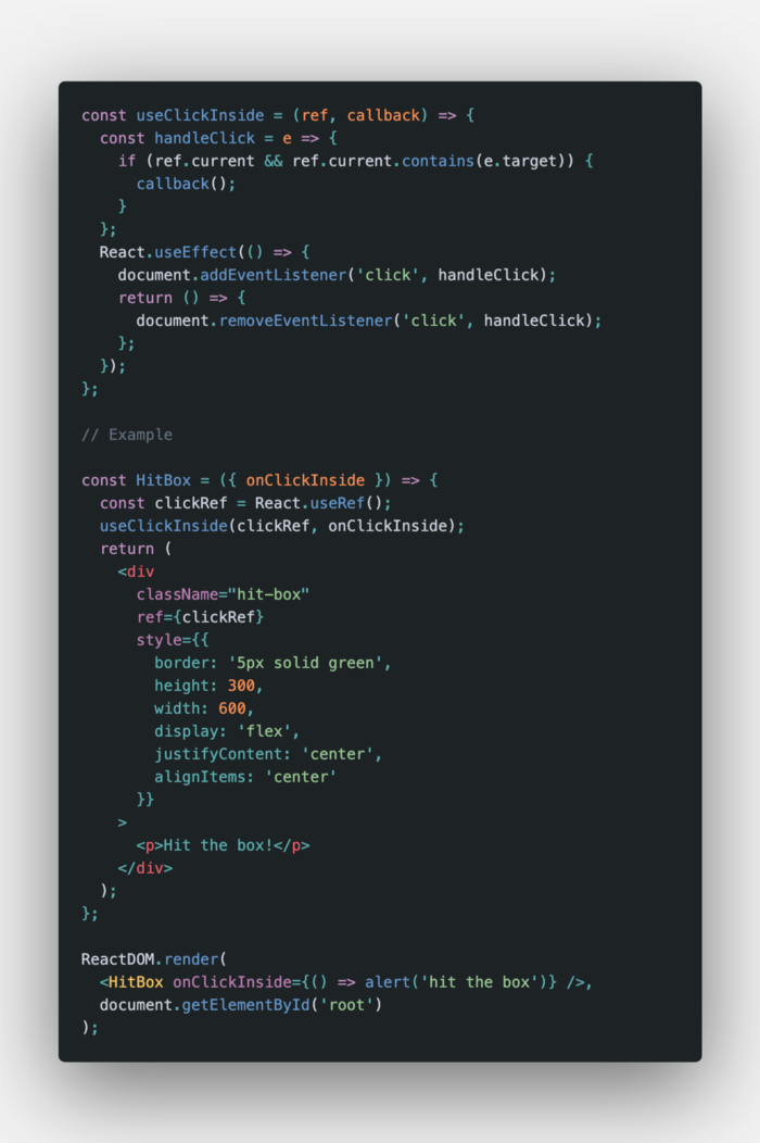 如果您处理在包装组件内部单击的事件处理,那么useClickInside钩子是正确的选择。首先,我们创建一个自定义钩子,它接受一个引用和一个回调来处理单击事件。然后,我们使用useEffect来添加和清除单击事件。最后,我们使用useRef为要单击的组件创建一个引用,并将其传递给useClickInside钩子。