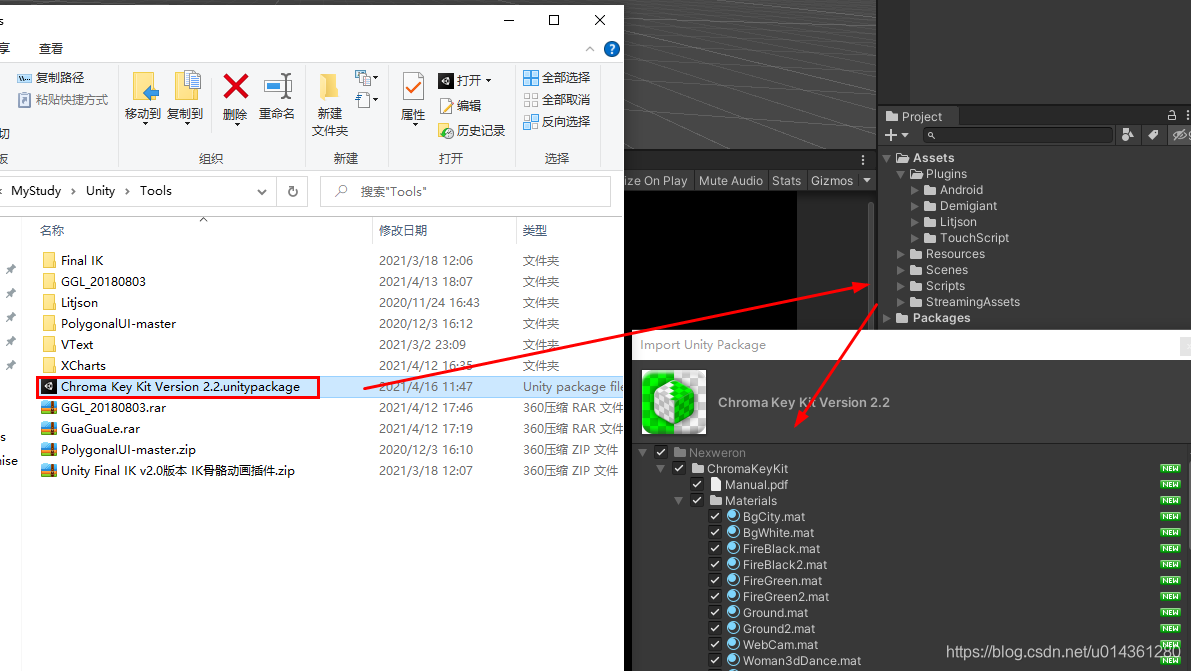 2、后缀 .unitypackage 资源方式的导入方式,Unity 也会自动解析处理添加进来
