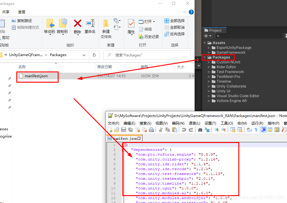 4、在 Packages 中的 manifest.json 文件中添加自己需要的依赖包,打开 Unity 工程的时候,会自动进行对应加载
