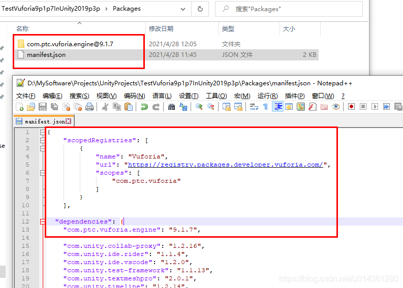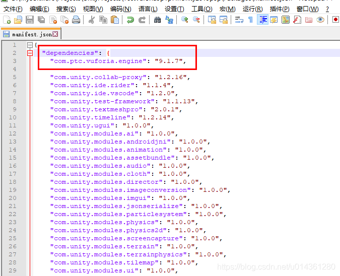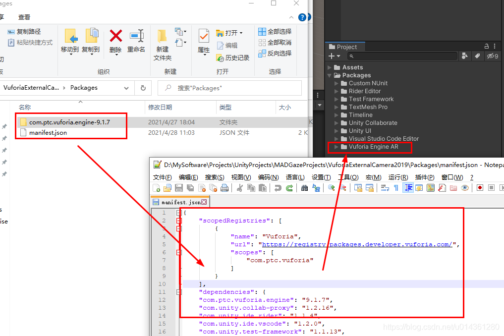 8、把得到的 com.ptc.vuforia.engine-9.1.7 添加到工程的 Packages 下,并在 manifest.json 中注册本地包信息