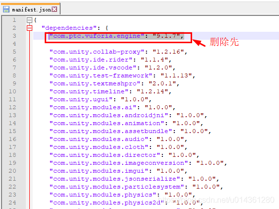 3、如果是一直处于 Resolving packages,可以先删除 "com.ptc.vuforia.engine": "9.1.7" ,这样工程就可以加载下去