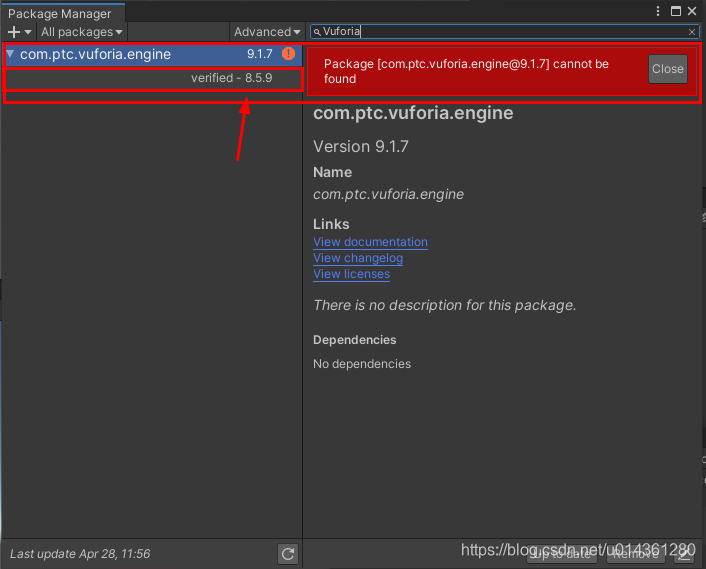 5、在 Package Manager 搜索 Vuforia ,一般找不到 9.1.7 版本的,有也可能不能正常下载