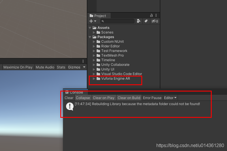 9、回到Unity,工程就会再次进行自动解析,加载本地 com.ptc.vuforia.engine-9.1.7,关于 Vuforia 报错的信息,也可能就没有