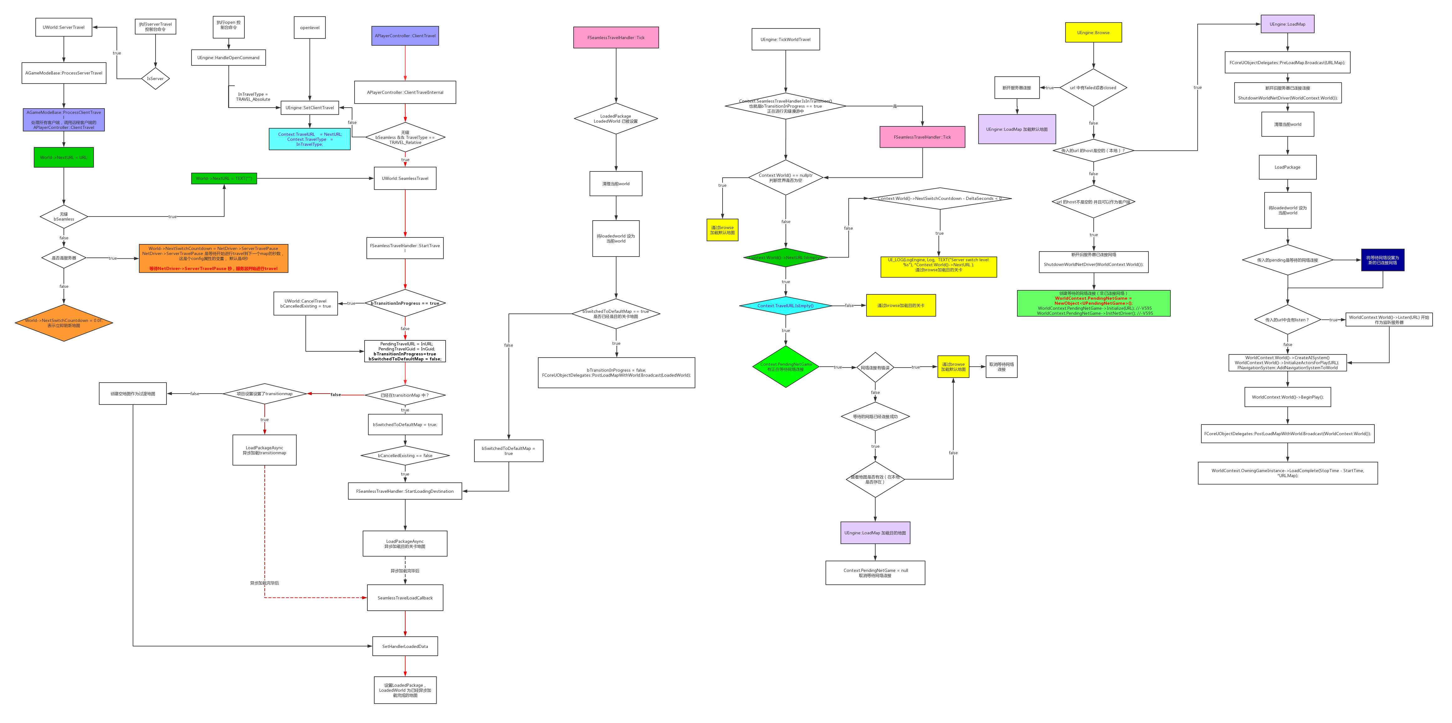 4.多人游戏的关卡切换时只建议在服务器端通过使用UWorld::ServerTravel的无缝模式进行,且此时无缝是指 传给UWorld::ServerTravel的TravelType = TRAVEL_Relative,且AGameModeBase::bUseSeamlessTravel 设置为 true。非无缝将导致服务器从调用UWorld::ServerTravel开始,NetDriver->ServerTravelPause秒(默认是4秒)后开始加载地图.且地图加载是阻塞状态。直到服务器加载完成地图后,客户端才开始进行地图加载,且加载过程也是阻塞状态。