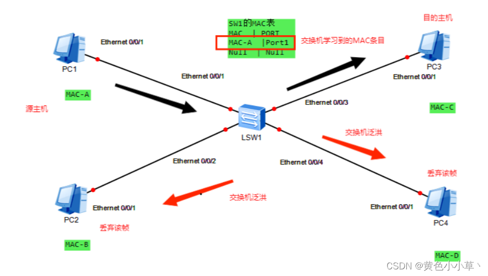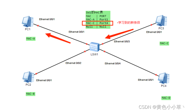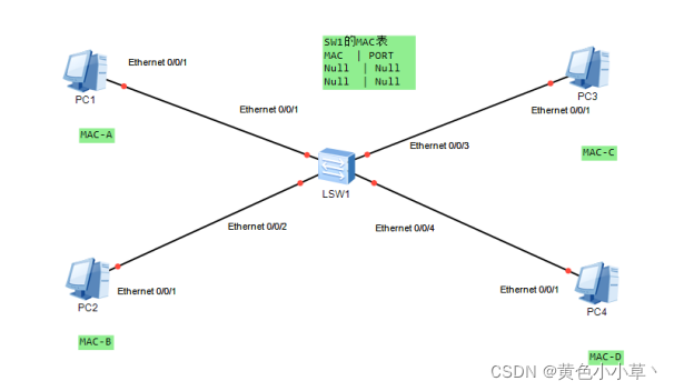 假设:交换机LSW1有4个端口,分别是port1,2,3,4,MAC缓存表为空;PC1的BIA(MAC)地址为MAC-A,PC2的BIA(MAC)地址为MAC-B,PC3的BIA(MAC)地址为MAC-C,PC4的BIA(MAC)地址为MAC-D。