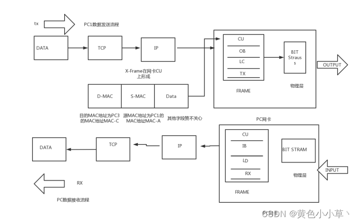 4,PC1网卡CU收到Y-Frame后,先对该帧的目的地址进行匹配,由于Y-Frame的目的MAC地址为MAC-A,而PC1的MAC地址为MAC-A,所以二者是匹配的,于是PC1的CU会将Y-Frame中的数据包抽取出来,上传至TCP/IP后到达应用软件。