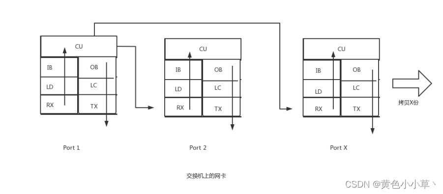 4,X-Frame被执行泛洪操作后,交换机的其他网卡都会从port1的CU处获得一个X-Frame的拷贝。这些拷贝的运动过程为:port1的网卡CU-->port2的网卡OB-->port2的网卡LC-->port2的网卡TX-->双绞线-->port2的网卡RX-->port2的网卡LD-->port2的网卡IB-->port2的网卡CU-->port-X的网卡OB--LC--TX--双绞线--port-X的网卡RX--LD--IB--CU...