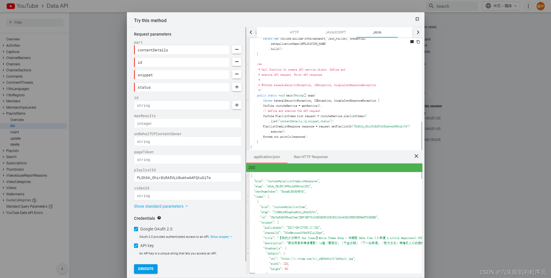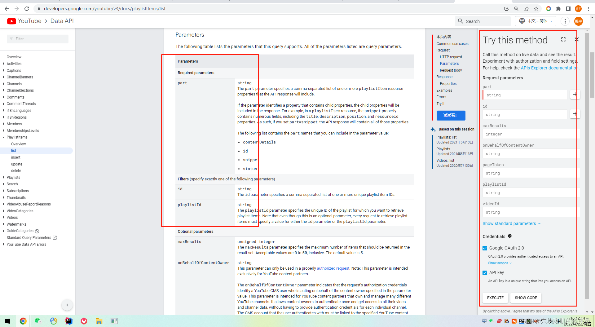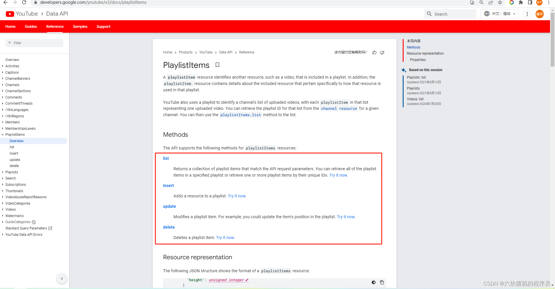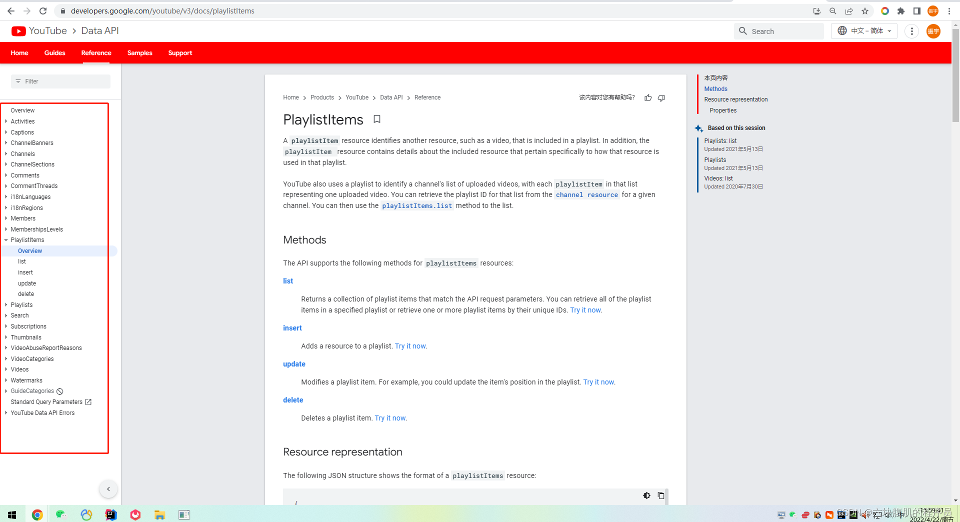 进入youtube官方的开发人员页面可以看到左边list中有对视频各种详细的视频相关信息获取的功能说明,playlistitems就是通过合辑url去获得合辑下每一个视频的信息。这里只对playlistitem的用法进行说明。