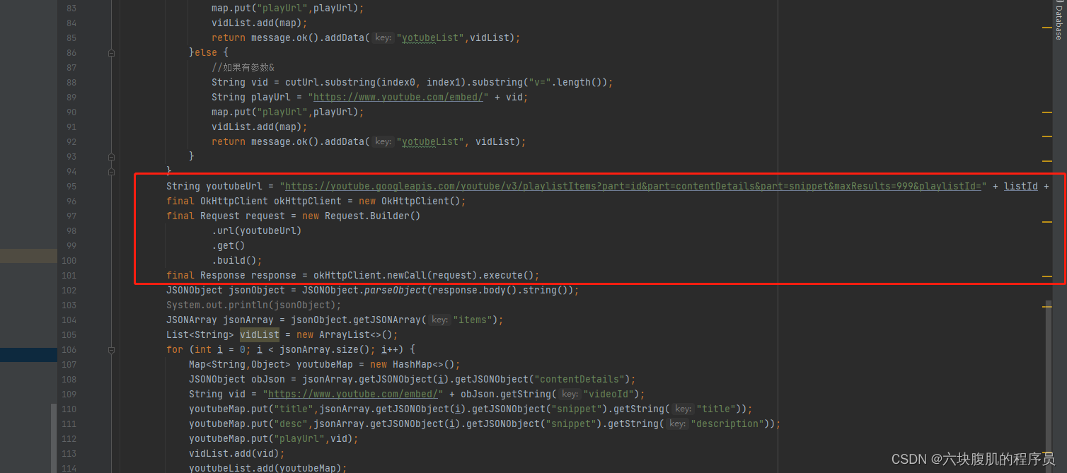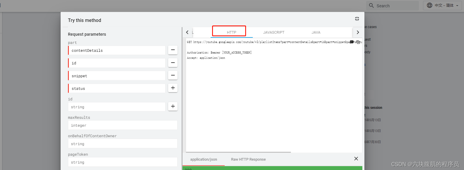 进入该方法的代码说明,可以看到各个语言版本的代码实现 ,这里可以通过官方的代码实现,也可以官方提供HTTP访问方式,然后直接通过okhttp吧拼接参数按照官方示例拼接好然后直接访问youtubeapi,过程更为简洁,代码量最小