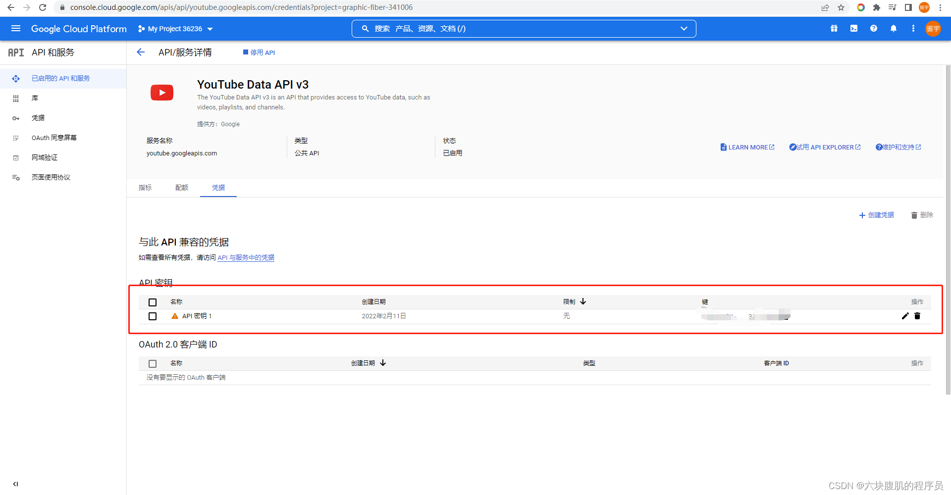 点击,启动该api,启用后进入api首页,左侧列表最下方创建一个凭据,创建完了之后就会获得一个自己的api密钥,如下图所示。