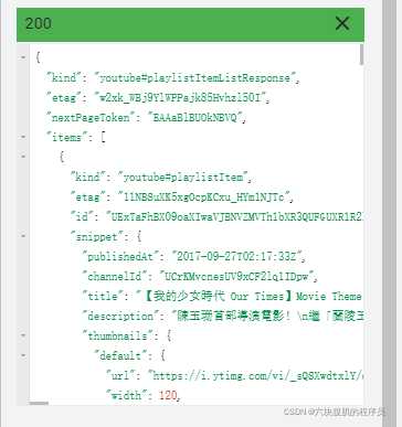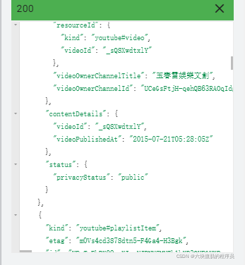 通过设置part参数,以及在playlistid框中输入listid,点击execute,可以看到以下返回信息,对应了上述的参数说明。