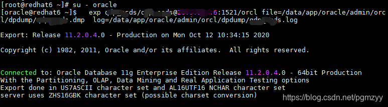 [oracle@redhat6 ~]$ exp 用户名/用户名@ip:1521/orcl file=/data/app/oracle/admin/orcl/dpdump/**.dmp log=/data/app/oracle/admin/orcl/dpdump/**.log
