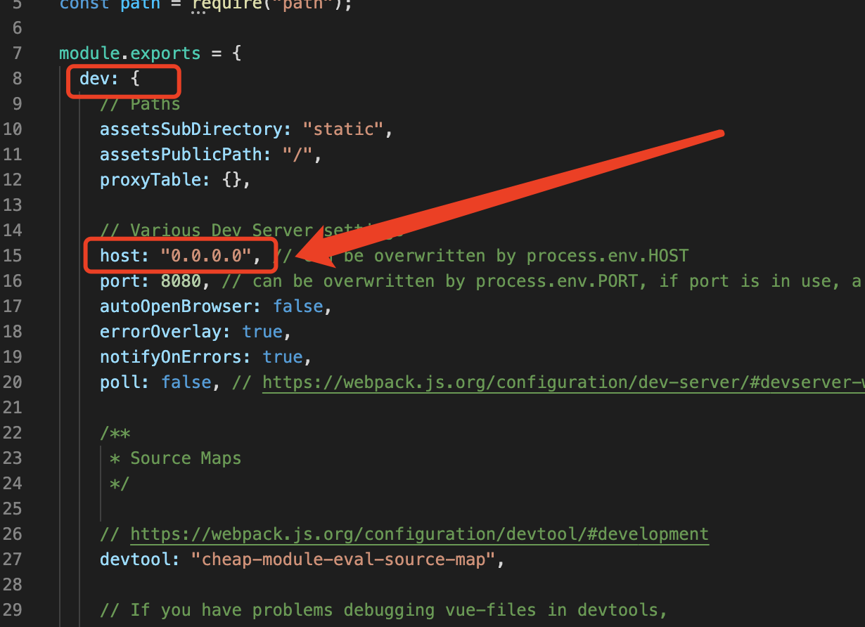2、在dev模块下,找到并修改 host 为 “0.0.0.0” (默认为localhost)