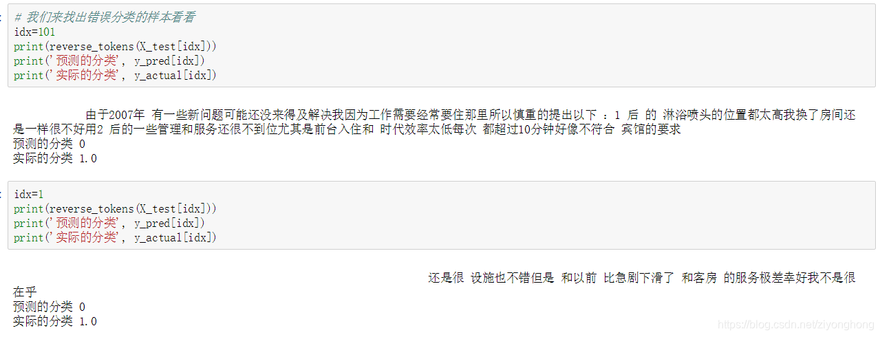 错误分类的文本 经过查看,发现错误分类的文本的含义大多比较含糊,就算人类也不容易判断极性,如index为101的这个句子,好像没有一点满意的成分,但这例子评价在训练样本中被标记成为了正面评价,而我们的模型做出的负面评价的预测似乎是合理的。