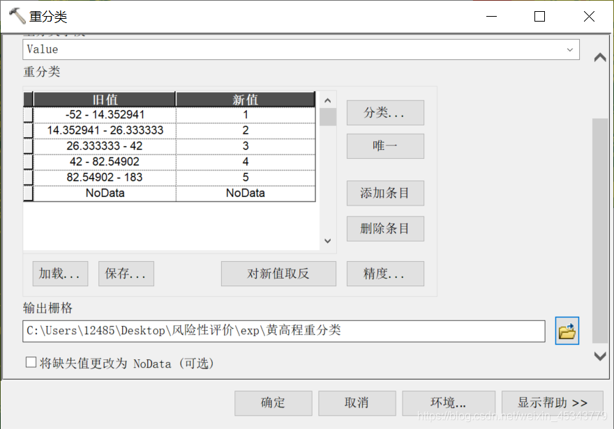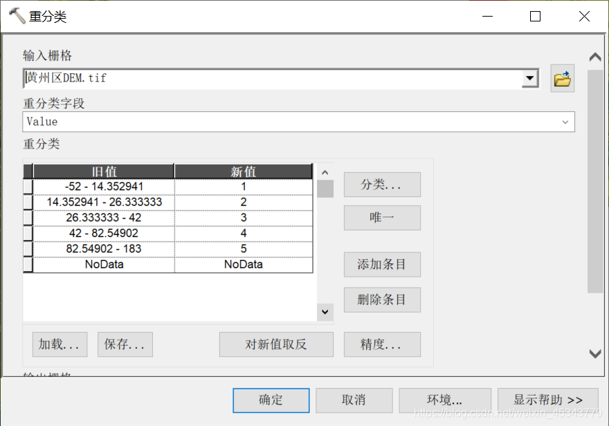 5.这里我们默认高程越高,对地质灾害贡献越大,所以新值分别取1,2,3,4,5.选择输出路径和文件名称,并点击确定。