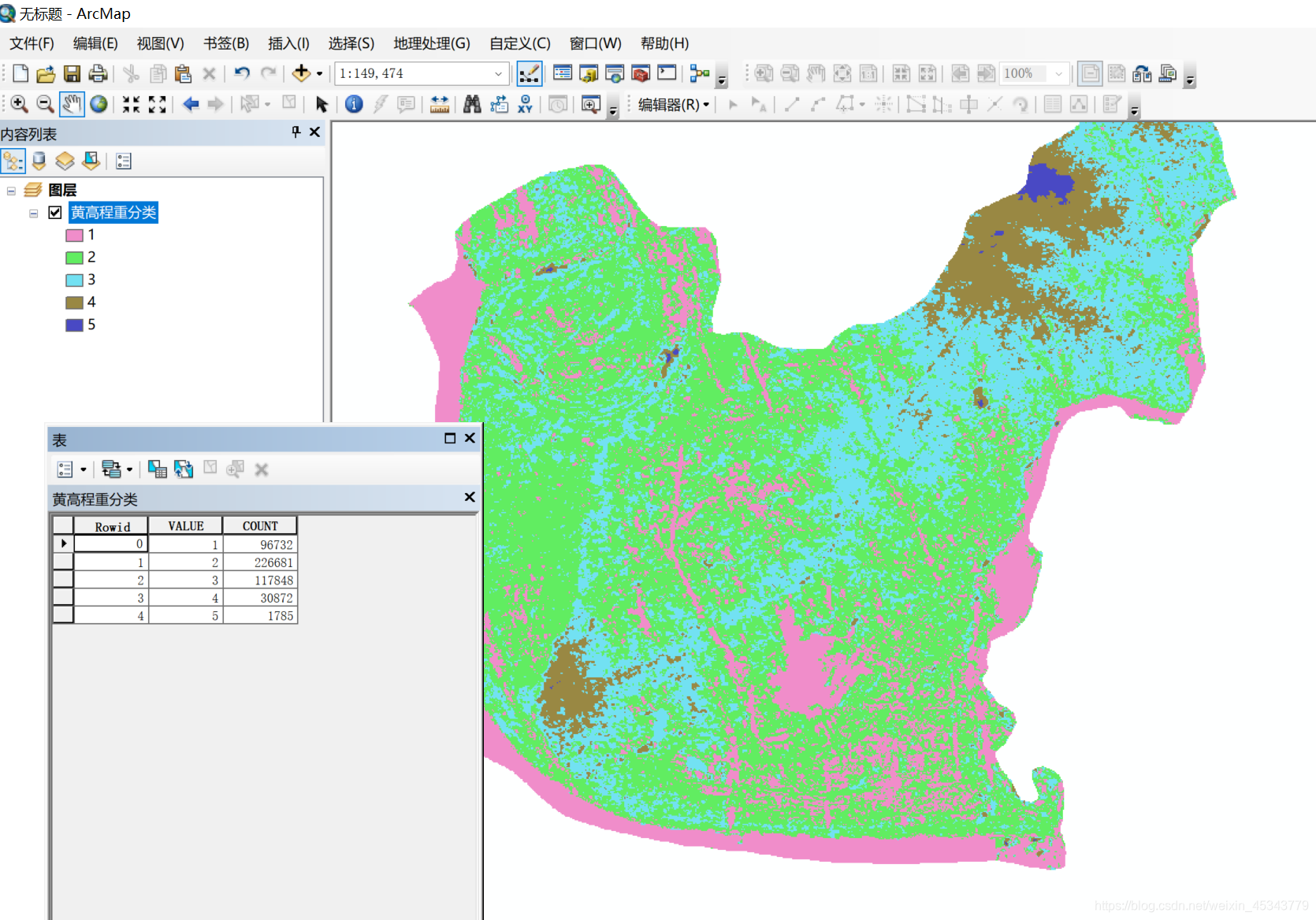 3.点击确定后,我们的高程数据就被分为了五个类别