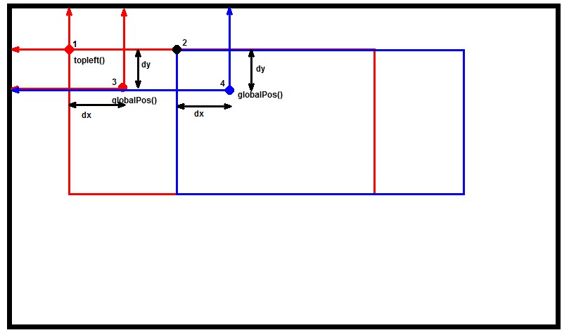 2号位置坐标的x坐标就为x()函数的值加上dx值(x()函数为窗体距离屏幕左侧的长度,y()函数为窗体距离屏幕顶端的长度),而dx值已由event->globalX() - last.x()获得。