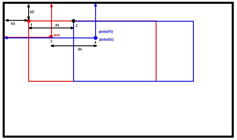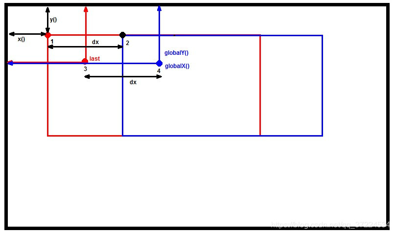 last变量保存鼠标相对于屏幕的全局位置,在图中是3这个位置。将窗体从红色位置移动到蓝色位置,也就是1号位置移动到2号位置,3号位置移动到4号位置,它们的移动距离是一样的。移动距离dx等于鼠标的全局X值减去last的x值(这里没有分析y,因为是水平移动的只有x轴发生变化),也就是4号位置的x坐标减3号位置的x坐标就是移动距离。