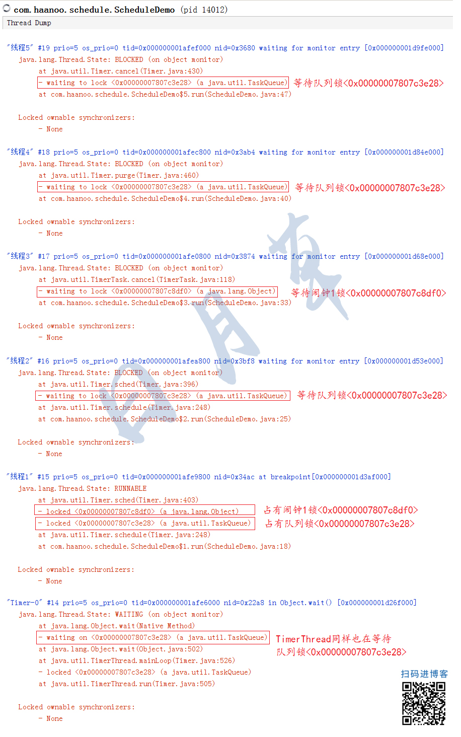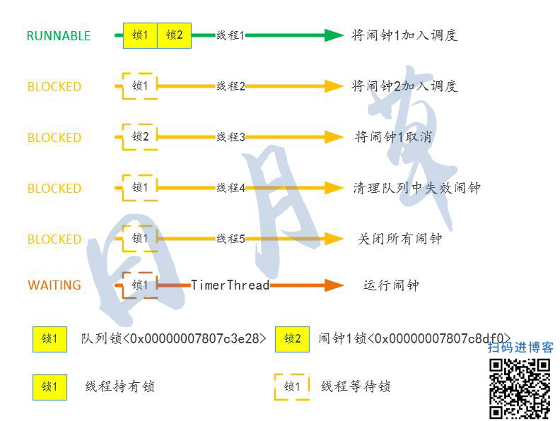 通过上面的快照可以看到,当“线程1“(持有两把锁)处于RUNNABLE状态时,”线程2“、“线程3”、“线程4”、“线程5”都处于BLOCKED状态。需要注意的是,因为TimerThread的时间未到,暂时处于WATING状态(等待唤醒)。