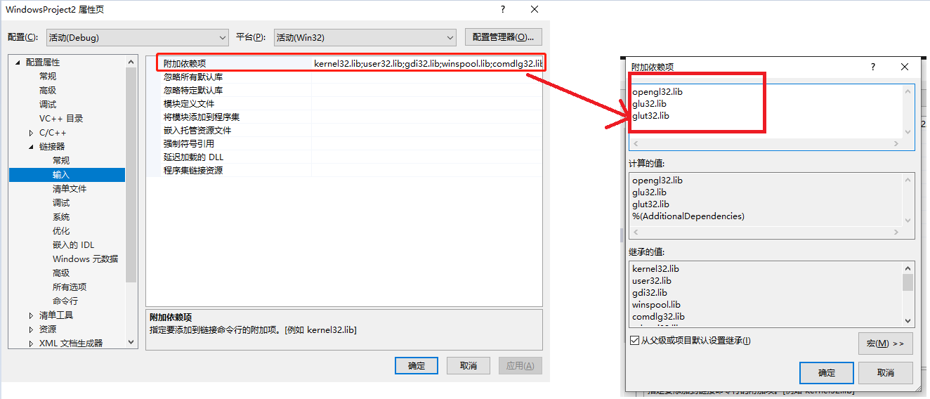 #pragma comment(lib,"glut32.lib")解决方法2:进入项目设置 - 链接器 - 输入 - 附加依赖项 - 需要的文件.lib
