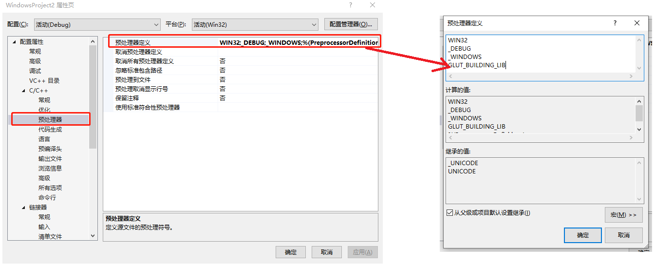 #define GLUT_DISABLE_ATEXIT_HACK解决方法2:项目属性 - C/C++ - 预处理器 - 预处理器定义 - 设置添加GLUT_BUILDING_LIB - 配置设为活动(debug) 。同栏目下的预编译头 - 找到预编译头 - 选择不使用预编译头。